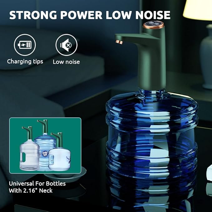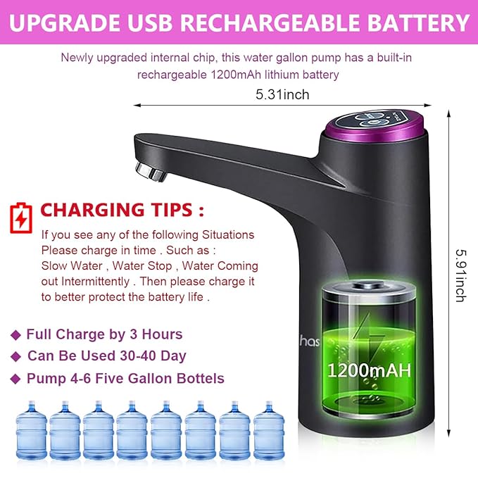 • [EASY TO USE]: Too heavy to lift and flip the water bottle onto the dispense machine? With this elegant water bottle pump, you can enjoy refreshing water by simple installation and touching the switch. No lifting or flipping anymore when you want to replace a new water bottle. The automatic water dispenser is easy to operate and save your time. Notice: Please charge water pump dispenser in time to avoid insufficient water outlet caused by power short.